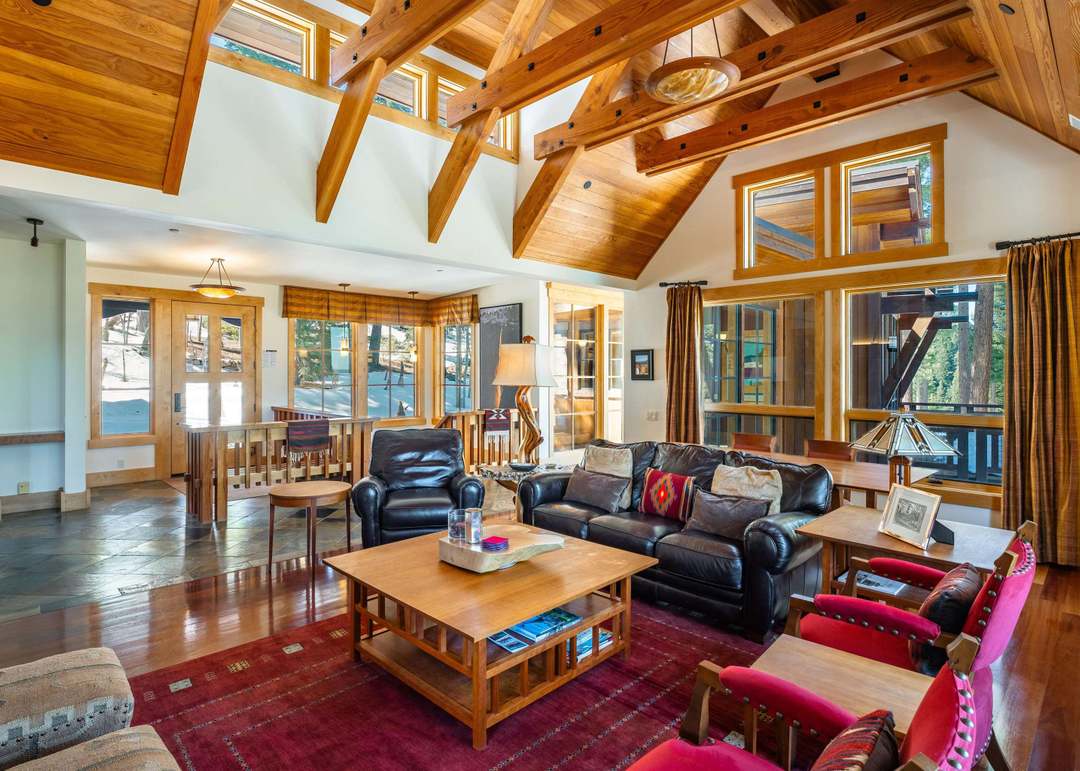A stunning mountain-modern great room showcasing dramatic exposed timber ceiling beams, cathedral vaulting, and abundant skylights that flood the space with natural light overlooking scenic views. The warm wood tones, professional furnishings with burgundy and red accents, and high-end custom millwork create a sophisticated yet inviting luxury retreat that seamlessly balances modern comfort with architectural grandeur.