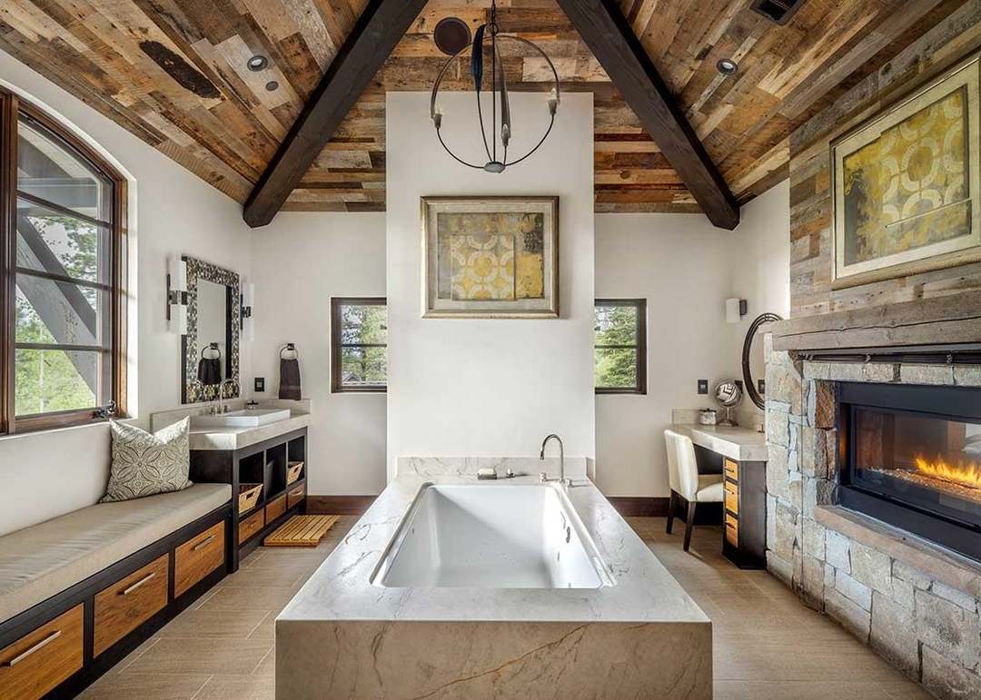 An exceptionally luxurious primary bathroom featuring a stunning marble soaking tub as the centerpiece, flanked by a working fireplace and commanding exposed timber ceiling beams in a vaulted cathedral space. The room masterfully combines mountain modern architecture (exposed wood, stone, glass) with transitional elegance, abundant natural light from multiple windows, and premium finishes including black hardware, marble countertops, and custom millwork throughout.