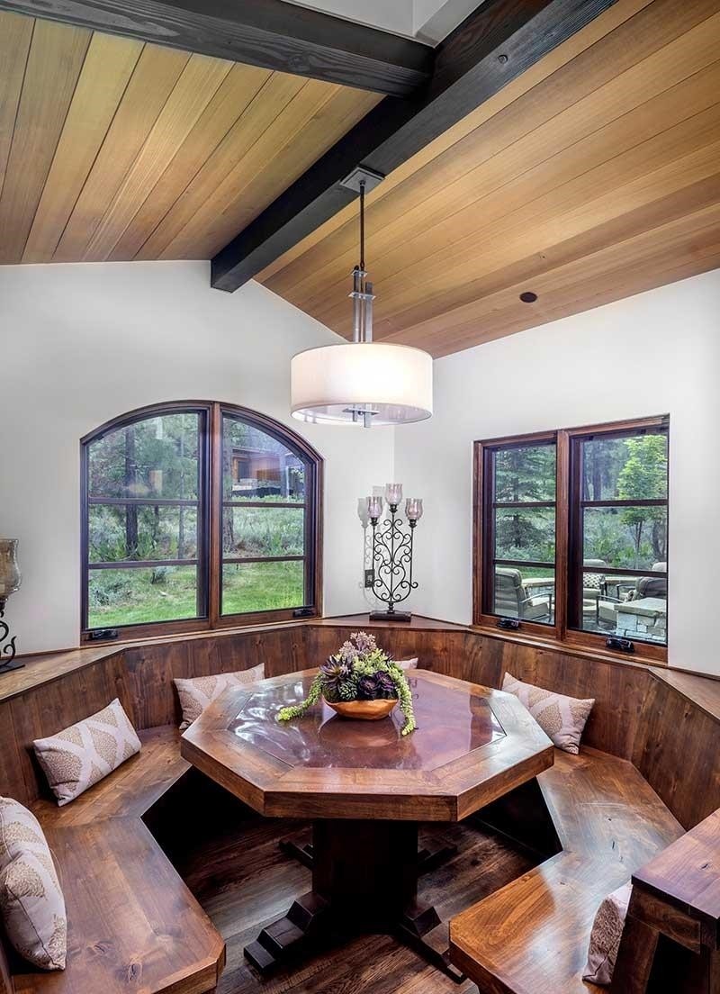A sophisticated dining nook featuring a custom hexagonal walnut table anchored by an elegant drum pendant light, nestled beneath a soaring wood-plank cathedral ceiling with exposed charcoal beams. The space combines traditional architectural details—wainscoting, arched windows with dark frames, and built-in bench seating—with warm, contemporary furnishings, creating an intimate yet luxurious retreat that frames views of surrounding forest.