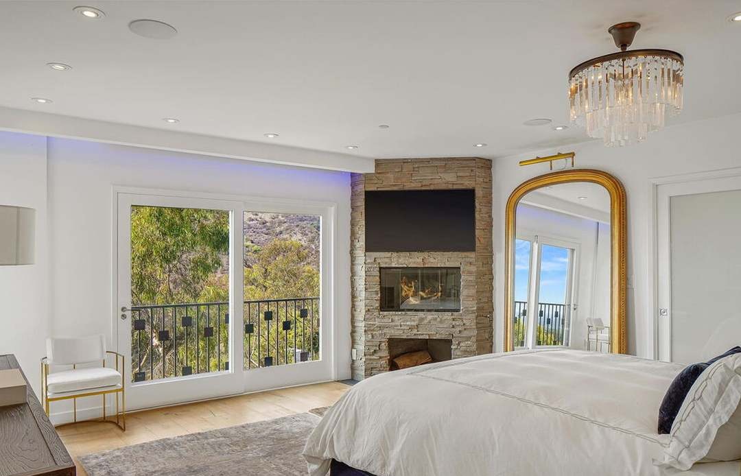 A sophisticated primary bedroom suite with abundant natural light, featuring a striking stone fireplace with integrated media, elegant crystal chandelier, and expansive views through French doors. The warm transitional design balances traditional architectural details like crown molding with contemporary furnishings and gold brass accents, creating a serene, luxurious retreat.