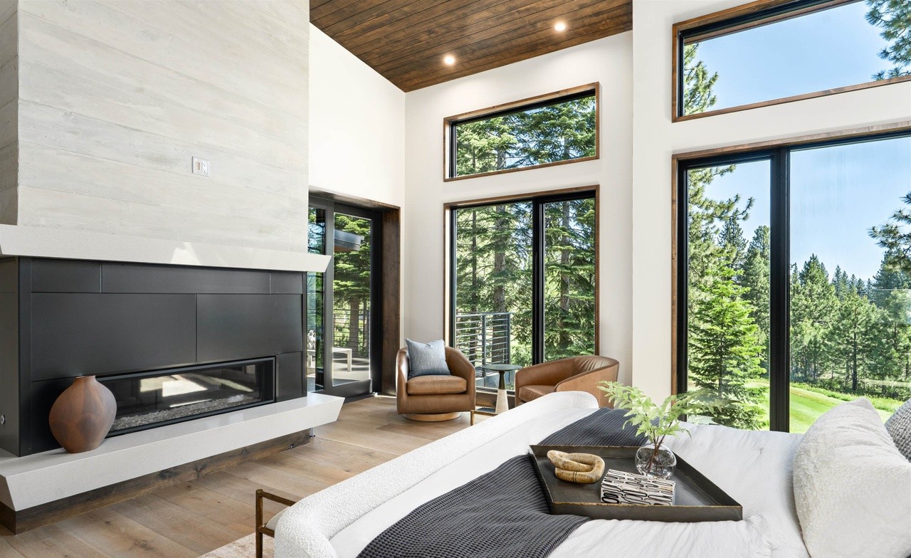 A stunning mountain-modern primary bedroom suite featuring expansive floor-to-ceiling windows framing pristine forest views, a sculptural fireplace accent wall in charcoal and white, and warm wood plank ceiling details. The space seamlessly blends luxury minimalism with organic warmth through cognac leather seating, natural hardwood flooring, and thoughtfully curated furnishings that emphasize the dramatic architecture and natural landscape.