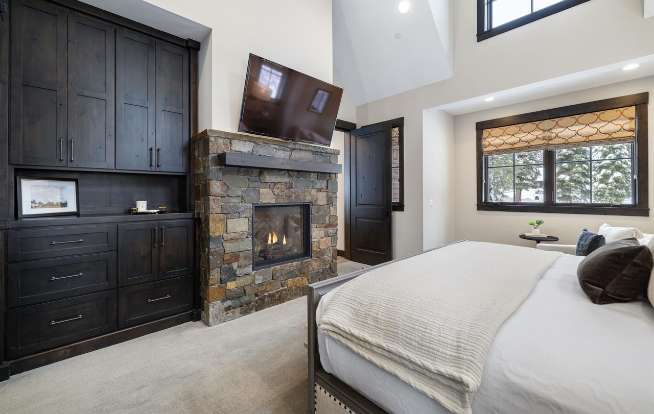 A stunning primary bedroom suite featuring a dramatic vaulted ceiling with skylights and a striking stone fireplace anchored by custom black cabinetry and built-in shelving. The sophisticated palette of black, cream, and natural stone creates a serene yet dramatic atmosphere, elevated by abundant natural light from expansive windows overlooking lush greenery and premium architectural details throughout.