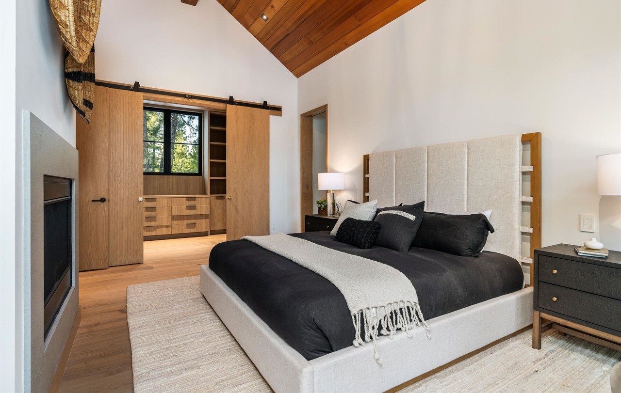 A sophisticated primary bedroom suite featuring a dramatic vaulted wood-plank ceiling and abundant natural light from floor-to-ceiling windows overlooking an integrated walk-in closet. The design balances organic warmth—evident in the rich hardwood tones and natural materials—with clean modern lines, creating a serene sanctuary anchored by a sculptural cream upholstered headboard and sharp black accents.