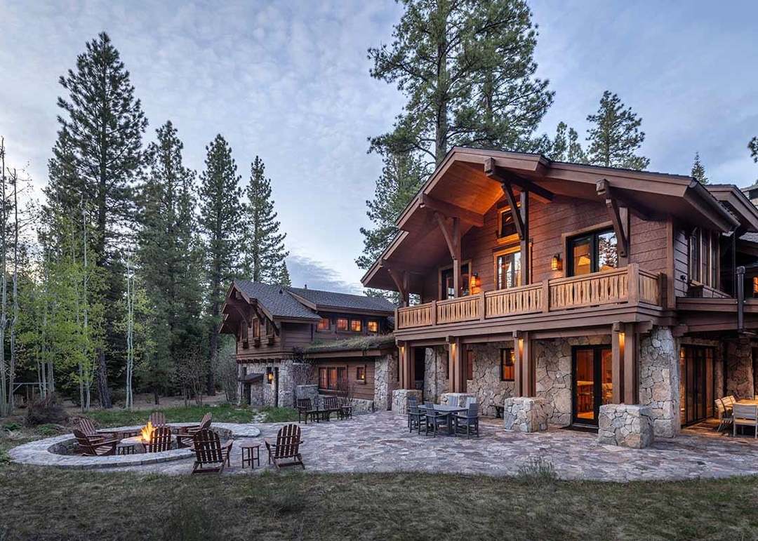 A stunning mountain resort-style patio featuring a dual-level stone and timber design with an active fire pit and integrated lounge seating, surrounded by towering pines and framed by professionally lit architecture at twilight. The space masterfully blends organic materials—natural stone columns, wooden railings, and exposed timber beams—with contemporary comfort and sophisticated outdoor living, creating an elevated retreat that feels both inviting and grand.