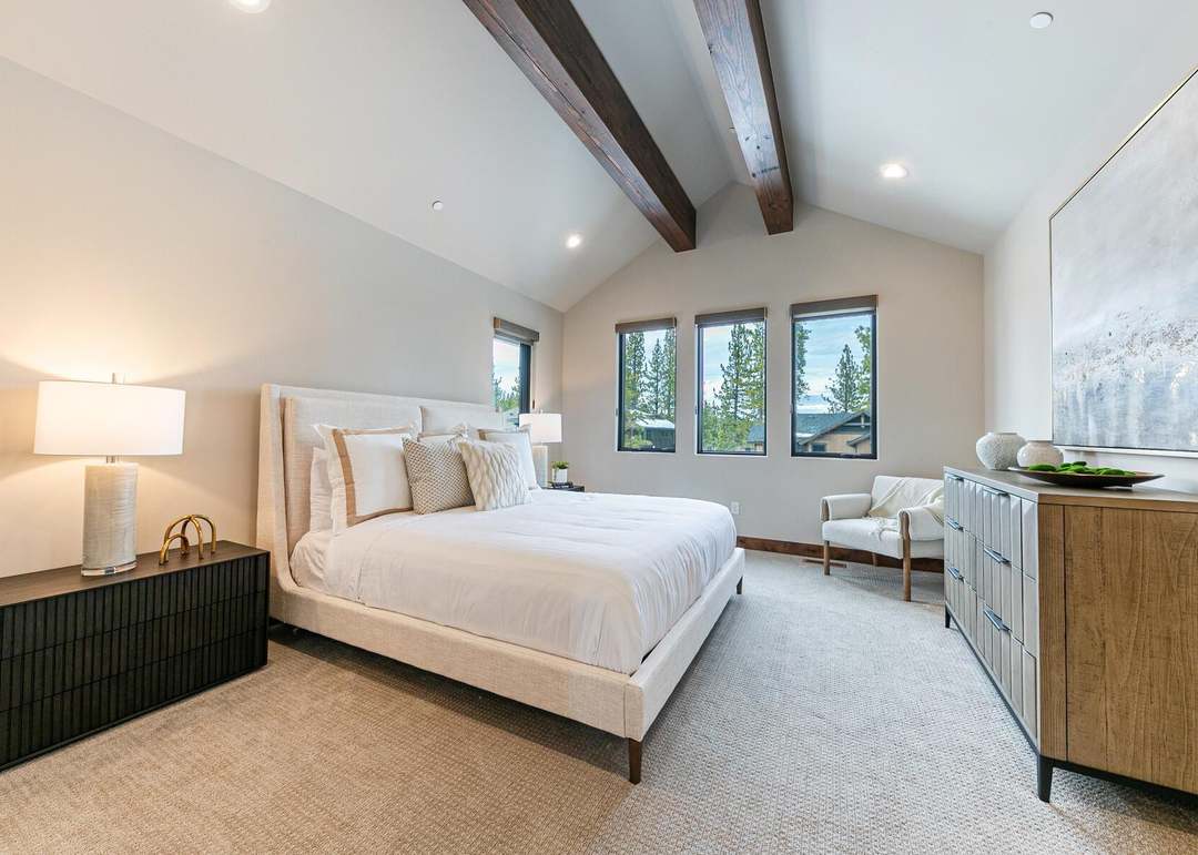 A sophisticated primary bedroom featuring a vaulted ceiling with dark exposed wooden beams, abundant natural light from triple-window views of forested landscape, and a harmonious palette of warm neutrals anchored by light wood furnishings and pristine white bedding. The design balances transitional architectural elements with organic modern comfort, creating a serene sanctuary with bespoke touches including custom wood dressers, layered textures, and elegant recessed lighting.