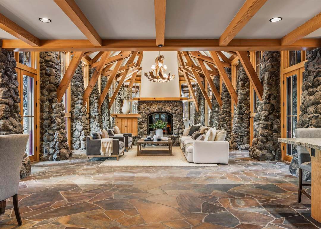 Exposed BeamsHigh CeilingsFloor To Ceiling WindowsFireplaceStatement LightingVaulted CeilingOpen ConceptAntler Chandelier