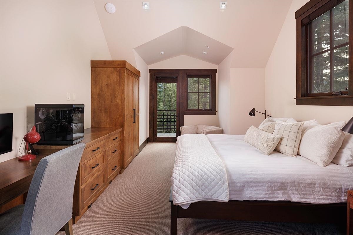 A serene primary bedroom suite featuring vaulted ceilings, abundant natural light from French doors and skylights, and a sophisticated palette of warm creams, beiges, and medium-toned wood furnishings. The space exemplifies transitional design with traditional architectural elements—including custom millwork and substantial wood cabinetry—paired with clean-lined modern furnishings and organic materials for an inviting luxury retreat.