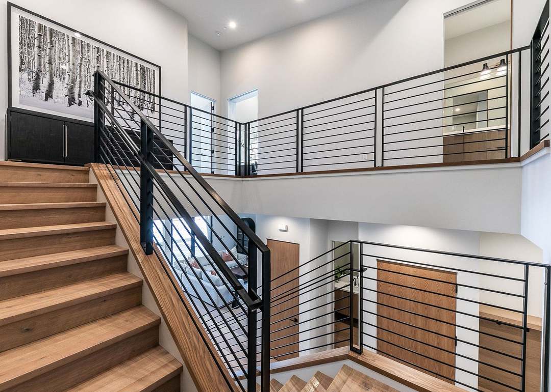 A striking contemporary staircase featuring natural wood treads with horizontal black metal cable railings, ascending through a double-height white-walled space with abundant natural light from skylights. The design balances industrial elements with organic warmth, creating a sophisticated focal point that exemplifies modern luxury residential architecture.