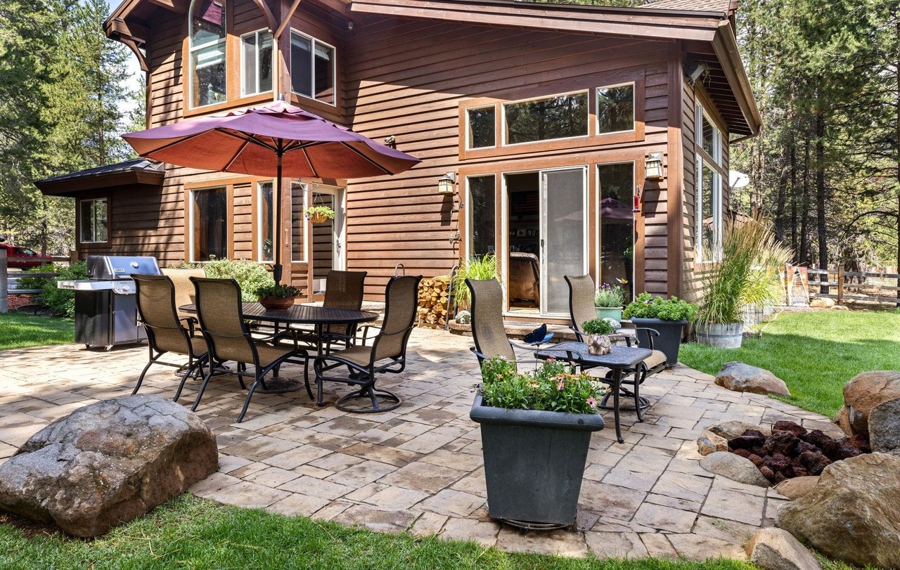 A sophisticated mountain-modern patio seamlessly integrates indoor-outdoor living with warm cedar wood siding, professional stone paver flooring, and thoughtfully placed natural boulders. The space features a covered pavilion with exposed timber framing, comfortable outdoor furniture, and a integrated grill and fire pit area, all unified by an earth-tone palette and abundant natural light.