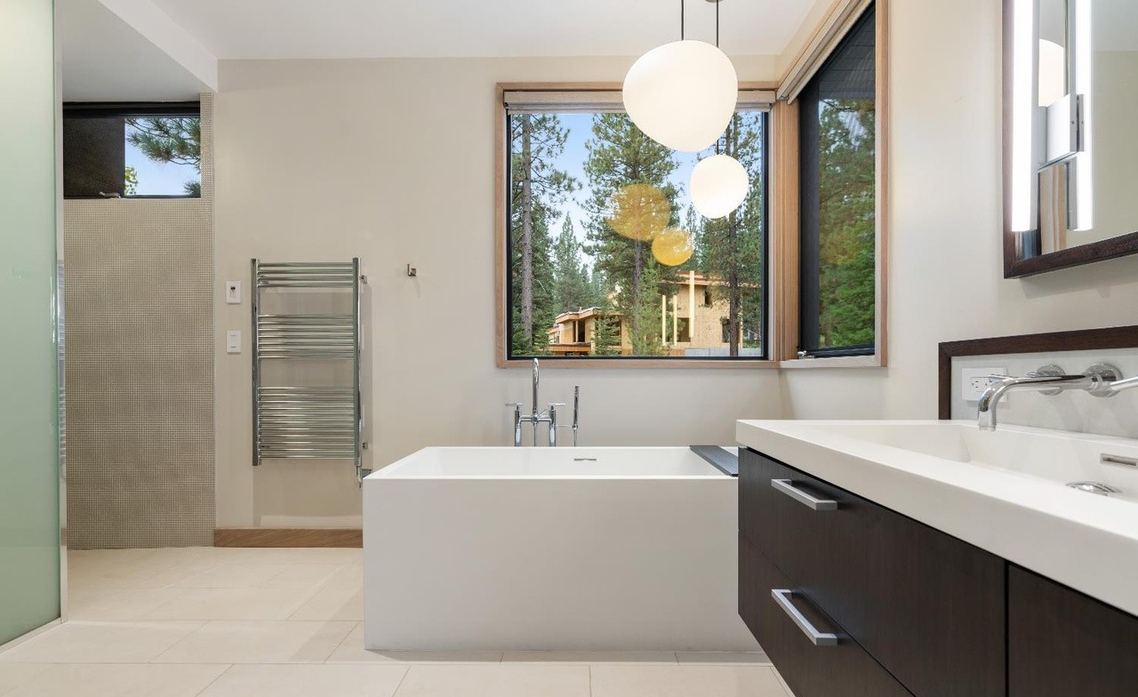 Freestanding TubWalk In ShowerFloating VanityDouble VanityStatement LightingFloor To Ceiling WindowsHeated Towel RackSkylightedHigh Ceilings