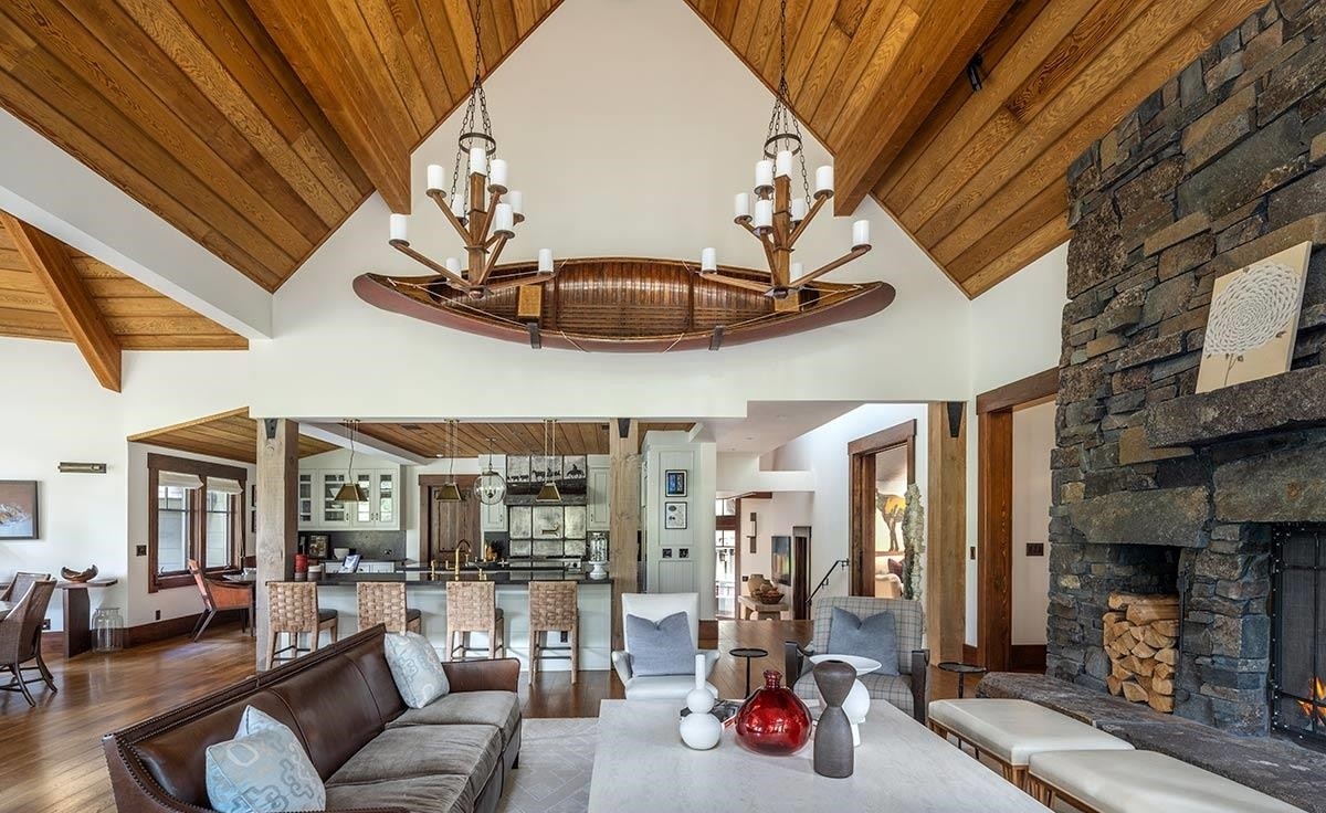 A breathtaking mountain modern great room featuring soaring cathedral ceilings with exposed wood beams, a dramatic floor-to-ceiling stacked stone fireplace, and a sculptural wooden boat chandelier as the artistic centerpiece. The space seamlessly blends rustic architectural elements with refined furnishings and warm earth tones, creating an intellectually designed luxury retreat with abundant natural light and commanding visual presence.