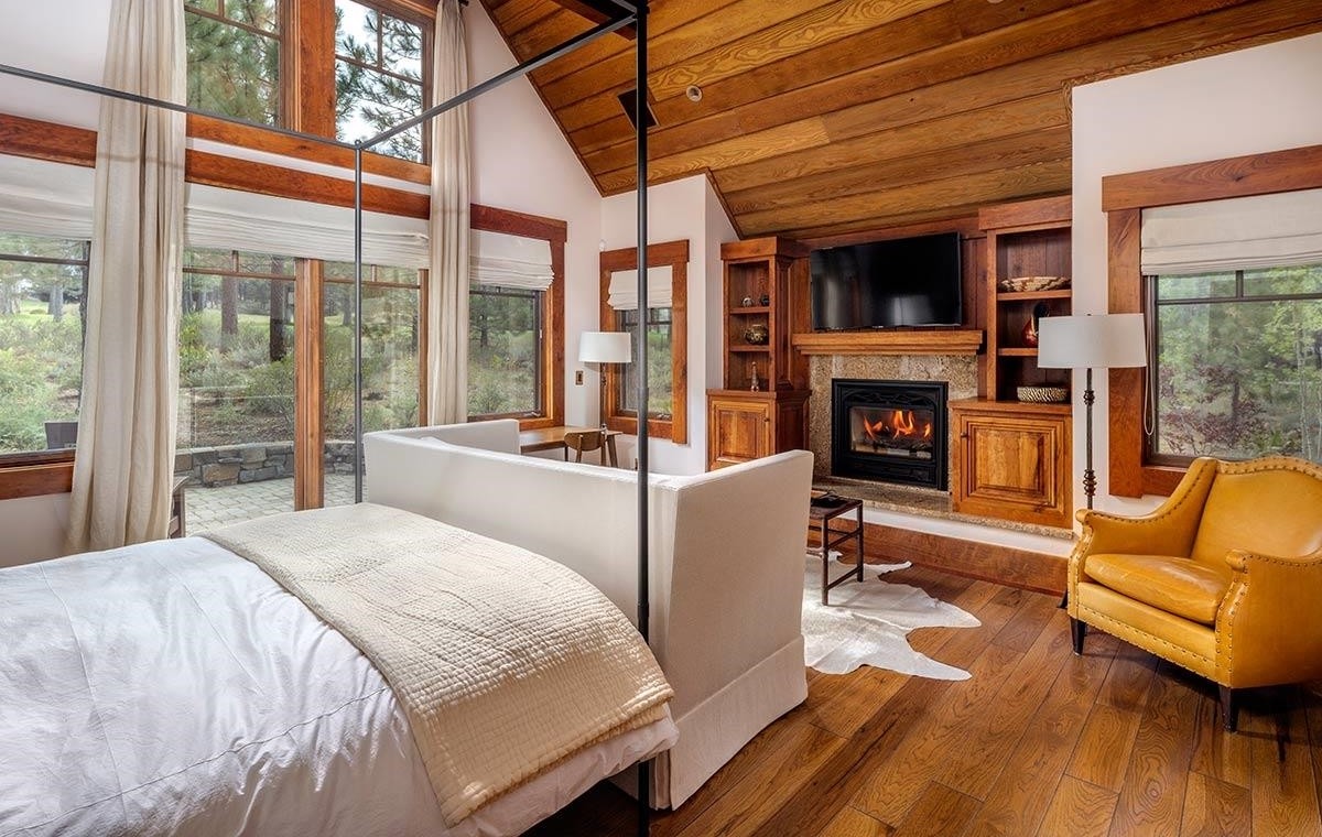 A stunning master bedroom suite seamlessly integrating an en-suite spa with soaring vaulted wood-beamed ceilings, abundant natural light from floor-to-ceiling windows, and a luxurious freestanding soaking tub positioned as a focal point. The space exemplifies organic modern design through warm natural wood finishes, white painted walls, and carefully curated furnishings including a rich mustard-yellow leather accent chair and integrated fireplace with custom wooden cabinetry.