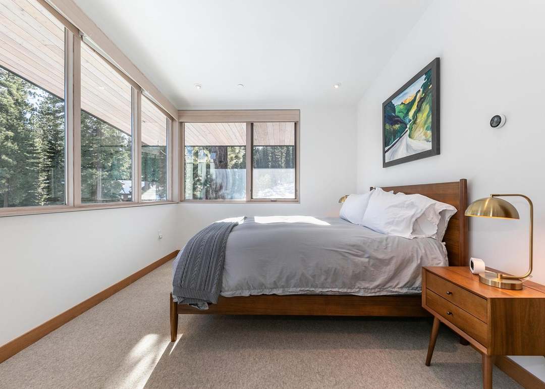A serene mid-century modern primary bedroom with exceptional natural light from floor-to-ceiling windows overlooking forested landscape. The warm walnut furniture, crisp white linens, brass pendant lighting, and minimalist aesthetic create a sophisticated retreat that balances era-appropriate design with contemporary comfort.