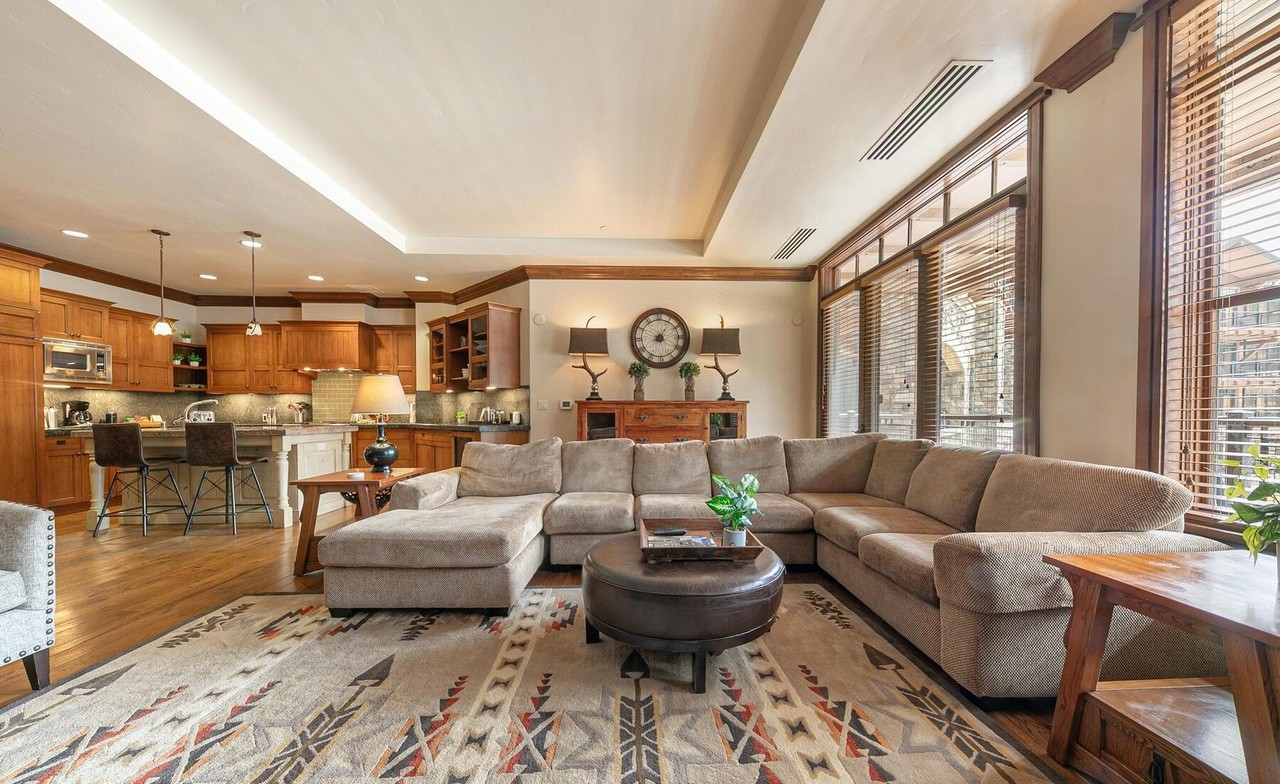 This sophisticated open-concept living area seamlessly blends transitional and organic modern design with warm wood tones, a tailored sectional sofa, and a curated kilim rug anchoring the space. Large multi-paned windows flood the room with natural light, while the tray ceiling with cove lighting, custom millwork, and brass-accented sconces create an elevated, refined atmosphere.