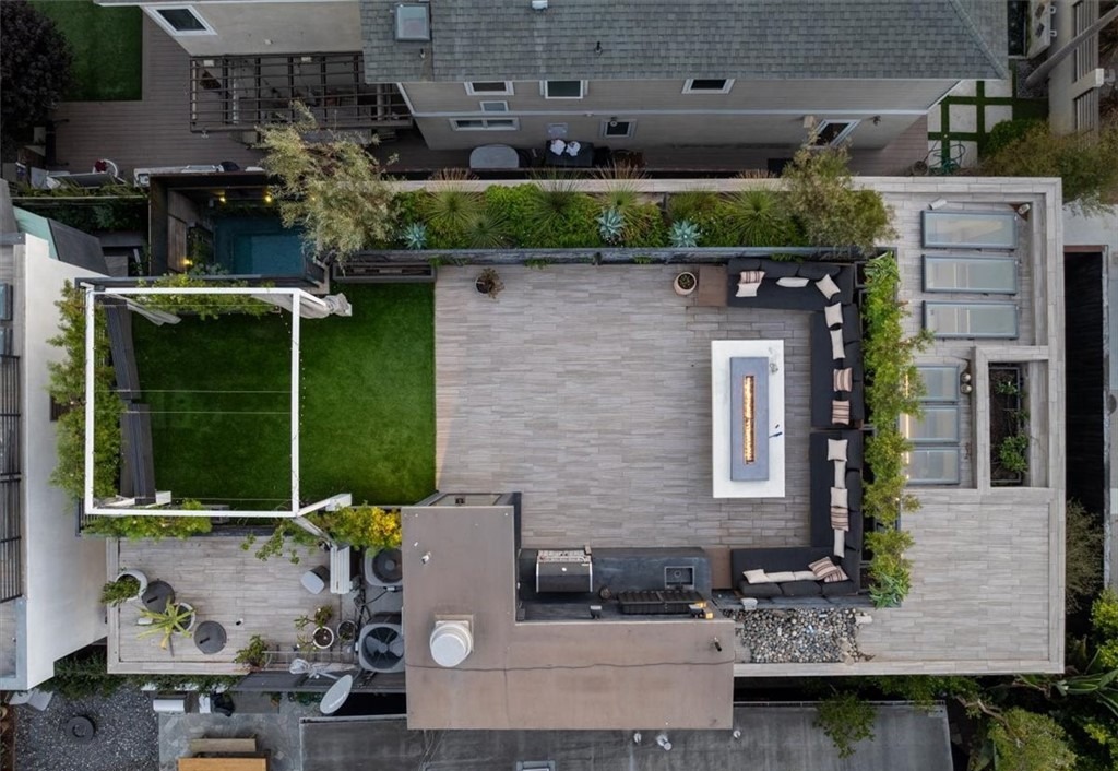 A meticulously designed rooftop patio featuring a sophisticated outdoor kitchen and living space with integrated fire pit, characterized by warm neutral tones, modern composite decking, and strategic greenery. The space balances functionality with serene aesthetics through clean lines, premium materials, and thoughtful landscape design.