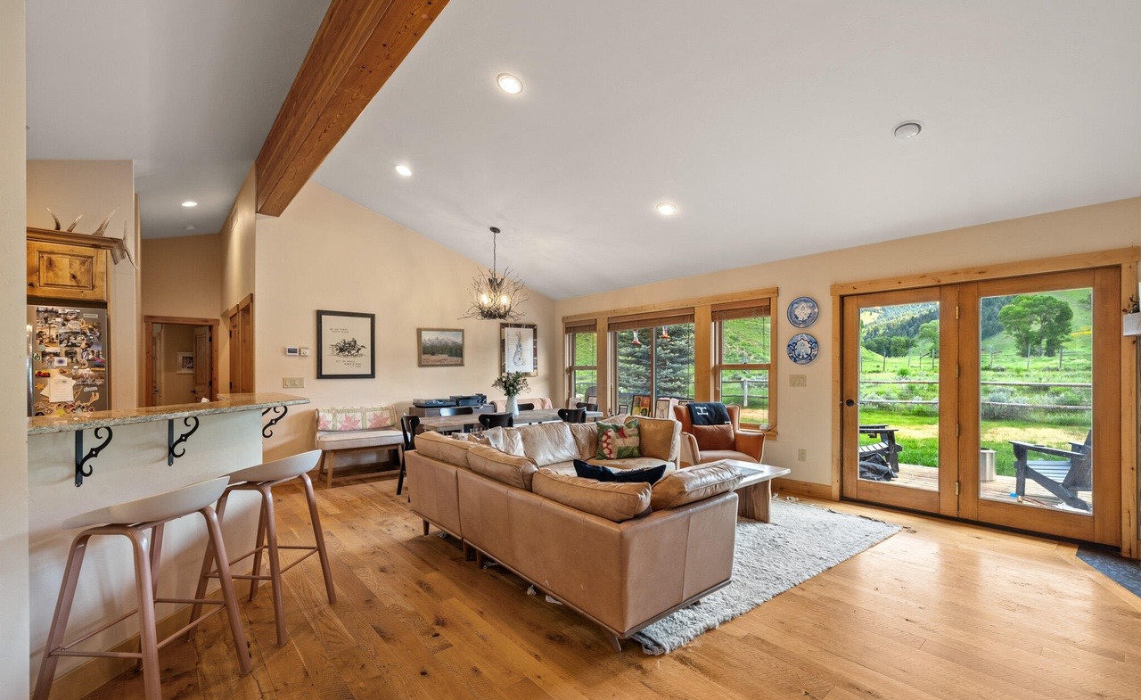 A stunning open-concept great room bathed in natural light from expansive wall-to-wall glass doors overlooking pastoral grounds, featuring warm hardwood flooring, an exposed timber beam, and a sophisticated mix of caramel leather and neutral furnishings that blend organic warmth with modern elegance. The space exemplifies mountain West residential luxury with its seamless indoor-outdoor connection and refined transitional design.