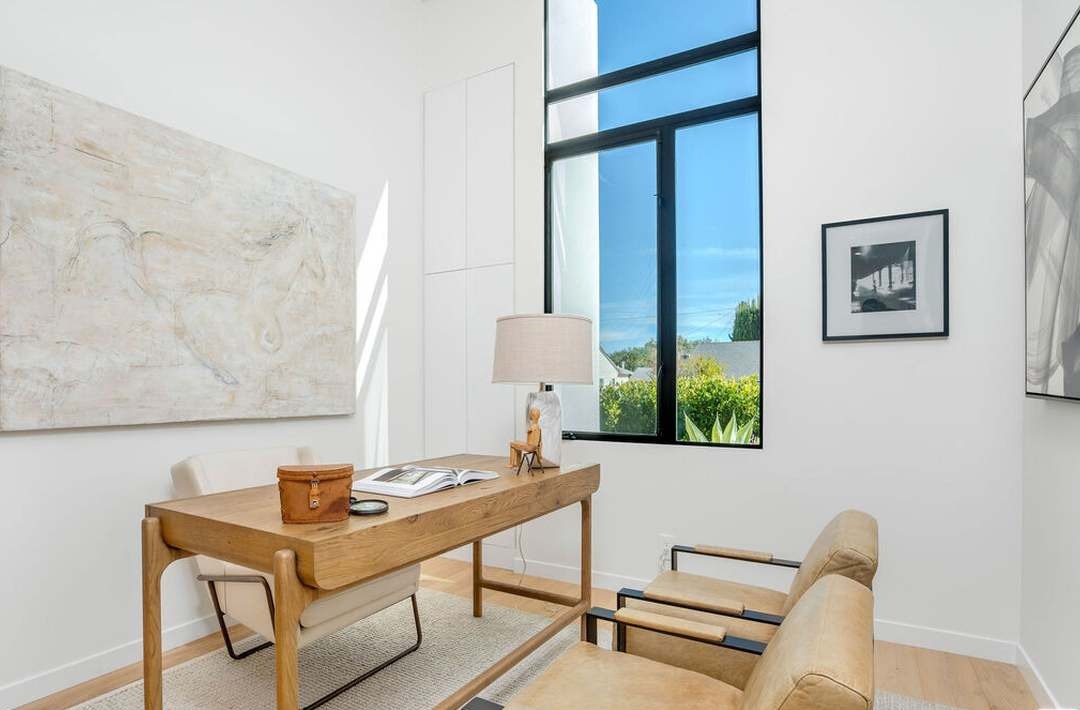 A refined mid-century modern home office featuring a sculptural oak desk with tapered legs, paired with minimalist leather and metal chairs that exemplify 1950s design principles. Floor-to-ceiling black-framed windows flood the serene, white-walled space with natural light, while a warm linen table lamp and carefully curated artwork create a sophisticated, distraction-free workspace with organic warmth.