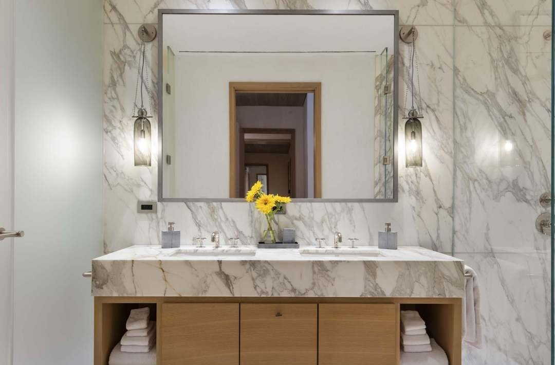 A stunning primary bathroom featuring floor-to-ceiling marble slab walls in soft gray and white veining, anchored by a generously proportioned floating double vanity in natural light wood with a coordinating marble top. Brass pendant fixtures and carefully composed yellow florals add warmth and personality to this otherwise minimalist composition of high-end materials and refined restraint.