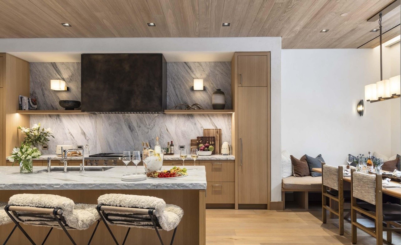 A stunning ultra-luxury open-concept kitchen featuring warm natural wood cabinetry paired with elegant marble countertops and backsplash, anchored by a dramatic waterfall island that commands the space. The design seamlessly blends organic modern warmth with transitional sophistication, enhanced by a sculptural wood-plank ceiling, brass hardware, and abundant natural light that highlights the carefully curated material palette and custom millwork.