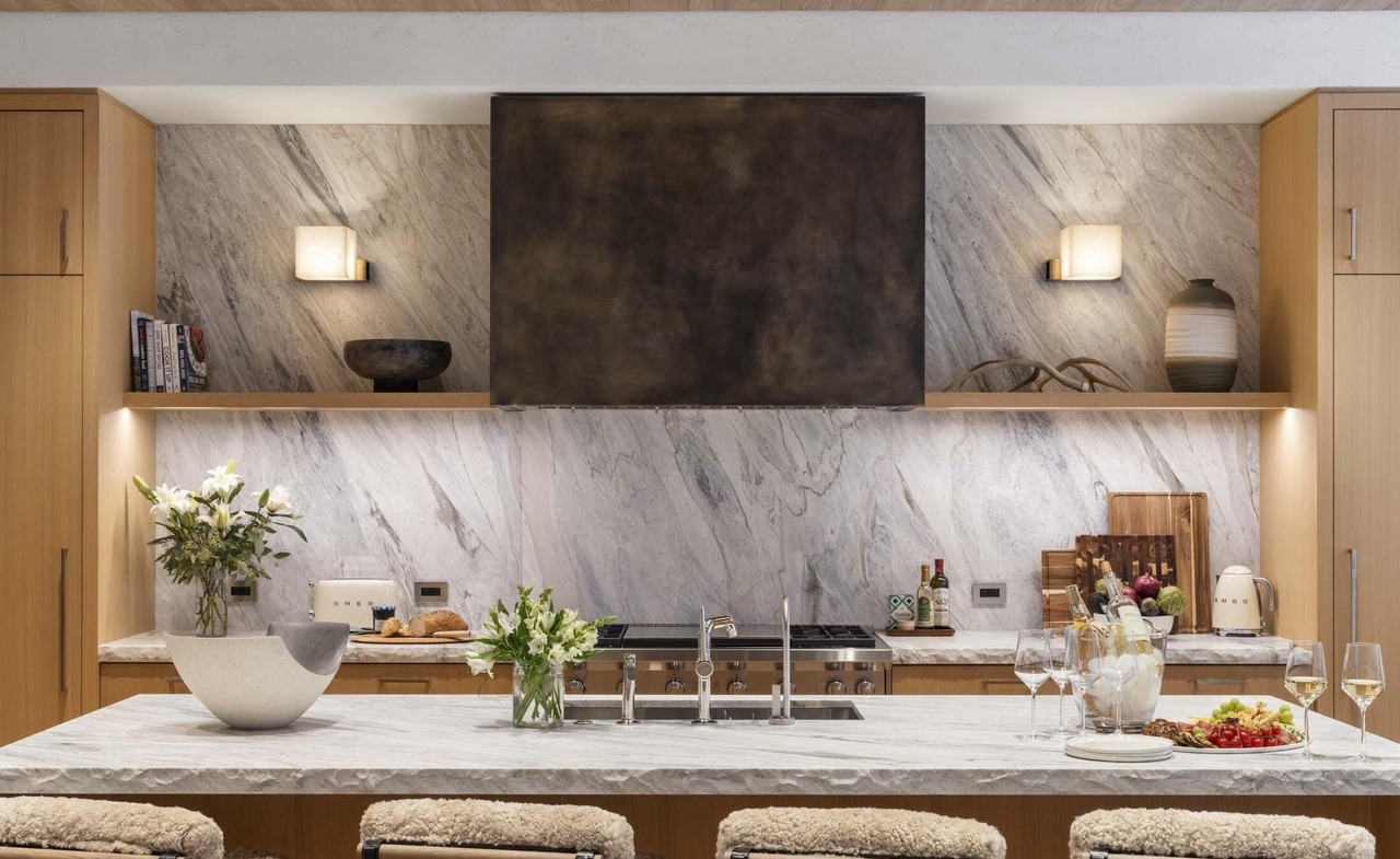 This ultra-luxury kitchen showcases a refined balance of natural materials and contemporary design, with a dramatic marble slab backsplash and countertops anchoring the space. The warm light wood cabinetry, custom shelving, and carefully curated styling convey sophisticated elegance with organic warmth.
