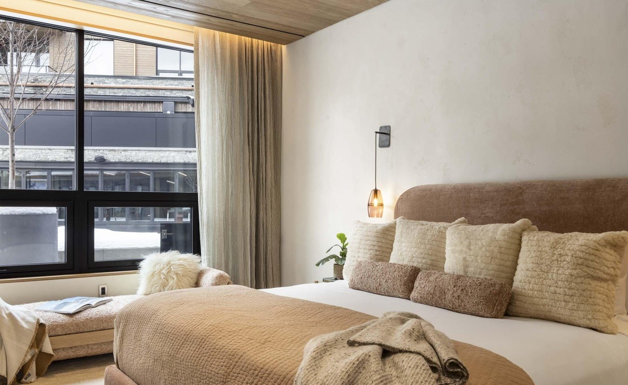 A serene primary bedroom featuring warm neutral tones, layered textures in linen and wool, and a wood-planked ceiling that adds warmth and architectural interest. Floor-to-ceiling windows flood the space with natural light, while a sculptural brass pendant and geometric sconce provide sophisticated accent lighting above the upholstered headboard.