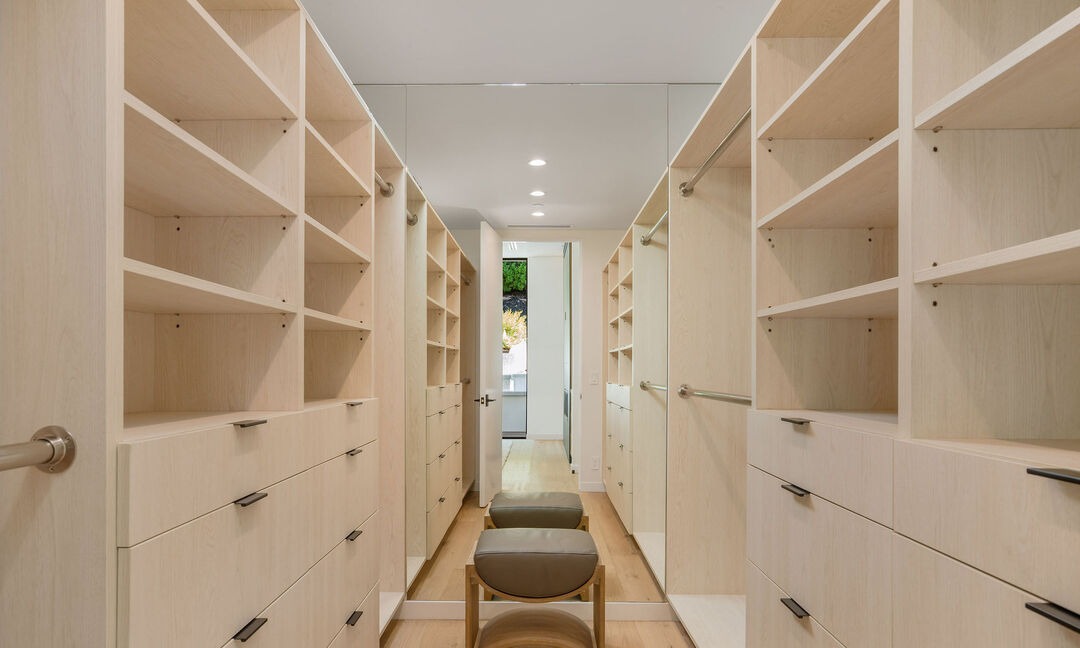 A meticulously designed walk-in closet featuring floor-to-ceiling light wood cabinetry with integrated open shelving and closed storage drawers, accented by brushed brass hardware and bright recessed lighting. The minimalist aesthetic is enhanced by mirrored panels and a clean white ceiling, creating a spa-like sanctuary that prioritizes organization and visual clarity.