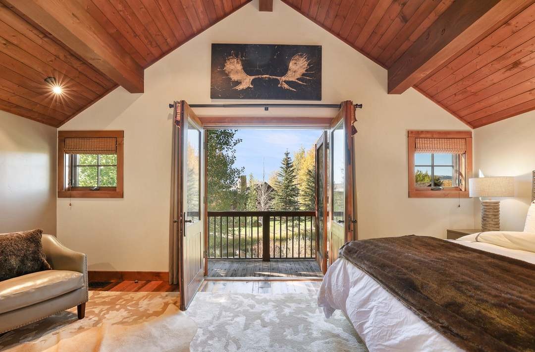 A sophisticated mountain-modern primary bedroom featuring a soaring vaulted wood-plank ceiling with exposed beams, abundant natural light from floor-to-ceiling windows and glass doors opening onto a deck overlooking forested landscape. The space combines warm wood tones, cream walls, and neutral furnishings with tasteful brass accents and landscape art, creating an airy yet luxurious mountain retreat.