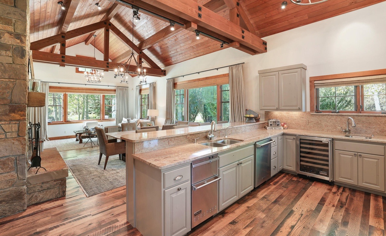 A stunning open-concept mountain modern kitchen featuring dramatic exposed wood beams, cathedral ceiling with skylights, and abundant natural light from expansive windows overlooking mature trees. The sophisticated design masterfully combines warm wood tones with light gray painted cabinetry, granite countertops, and professional-grade stainless steel appliances, anchored by a generously scaled island with waterfall edges and complemented by a striking stone fireplace.