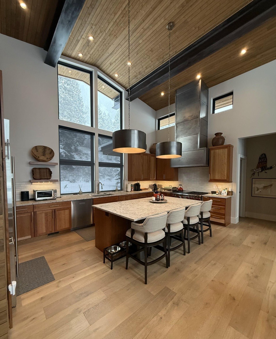 Waterfall IslandPendant LightingOpen ConceptHigh CeilingsFloor To Ceiling WindowsVaulted CeilingExposed BeamsStatement LightingCustom Millwork