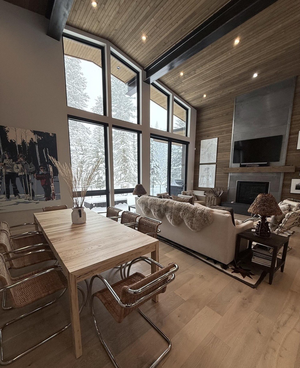 A sophisticated mountain modern living space with soaring wood-paneled ceilings, floor-to-ceiling black-frame windows showcasing snowy mountain views, and warm natural wood finishes throughout. The room seamlessly blends organic materials with contemporary furnishings, featuring a cream-colored sofa, rattan dining chairs, and a central fireplace, creating a refined yet inviting atmosphere perfect for alpine luxury living.