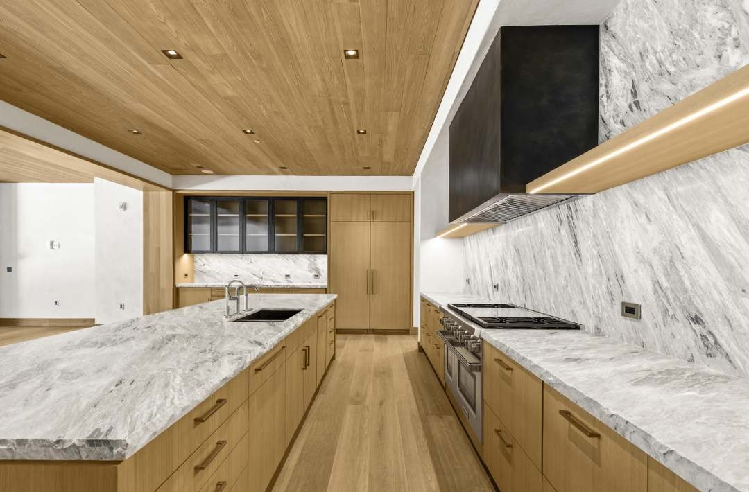 A stunning contemporary galley kitchen featuring natural light oak cabinetry paired with luxurious marble countertops and backsplash, unified by warm brass hardware and ambient under-cabinet lighting. The wood-planked ceiling and soft neutral palette create an inviting yet sophisticated atmosphere, with meticulous attention to detail in the custom millwork and professional-grade appliances.