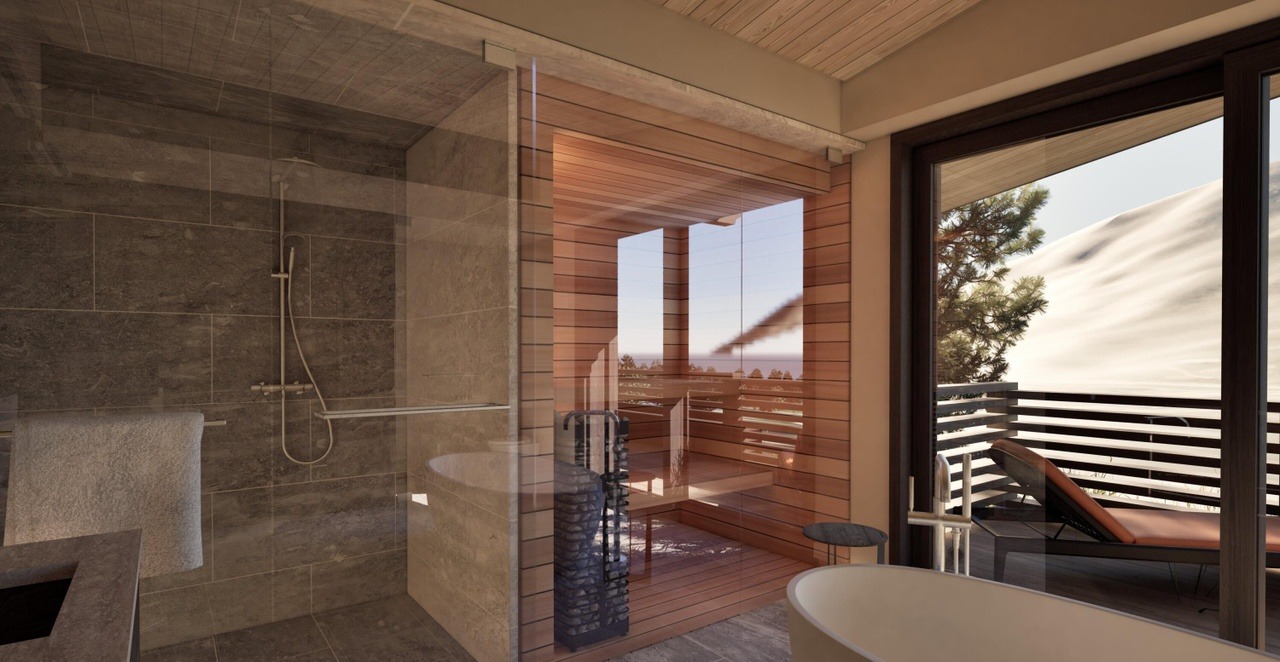 An ultra-luxurious primary bathroom seamlessly blending indoor and outdoor spaces with floor-to-ceiling windows opening to a wood-decked terrace with mountain views. The design harmonizes natural stone walls, warm wood plank ceiling, and contemporary fixtures including a sculptural freestanding soaking tub and spa-quality steam shower with large-format stone tile, creating a serene sanctuary elevated by abundant natural light and sophisticated material pairings.