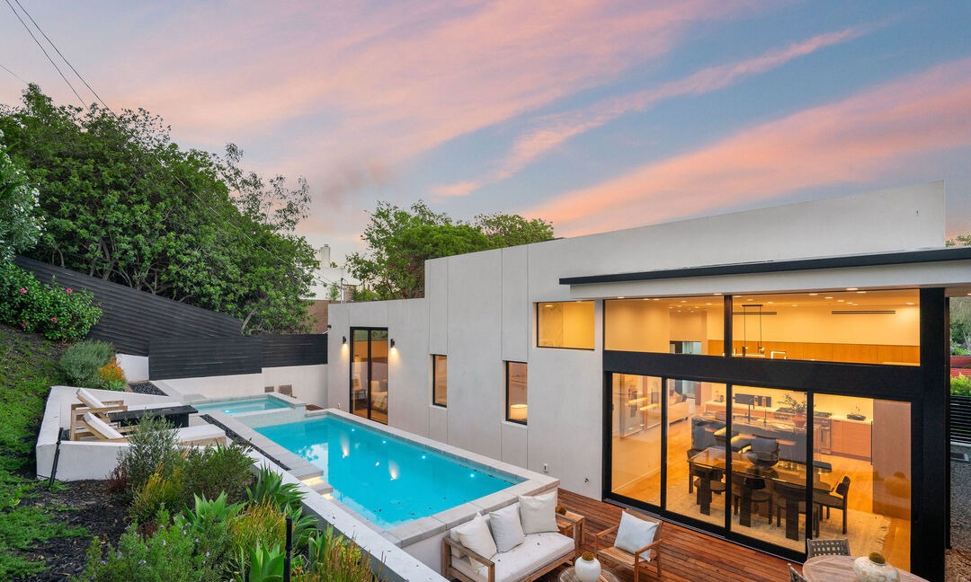 A stunning contemporary pool area featuring a pristine rectangular pool and integrated hot tub, anchored by a minimalist modern residence with white plaster walls and expansive black-framed glass doors. The design seamlessly blends indoor-outdoor living with warm hardwood decking, sophisticated furnishings, and lush landscaping, creating a serene luxury retreat bathed in golden hour light.