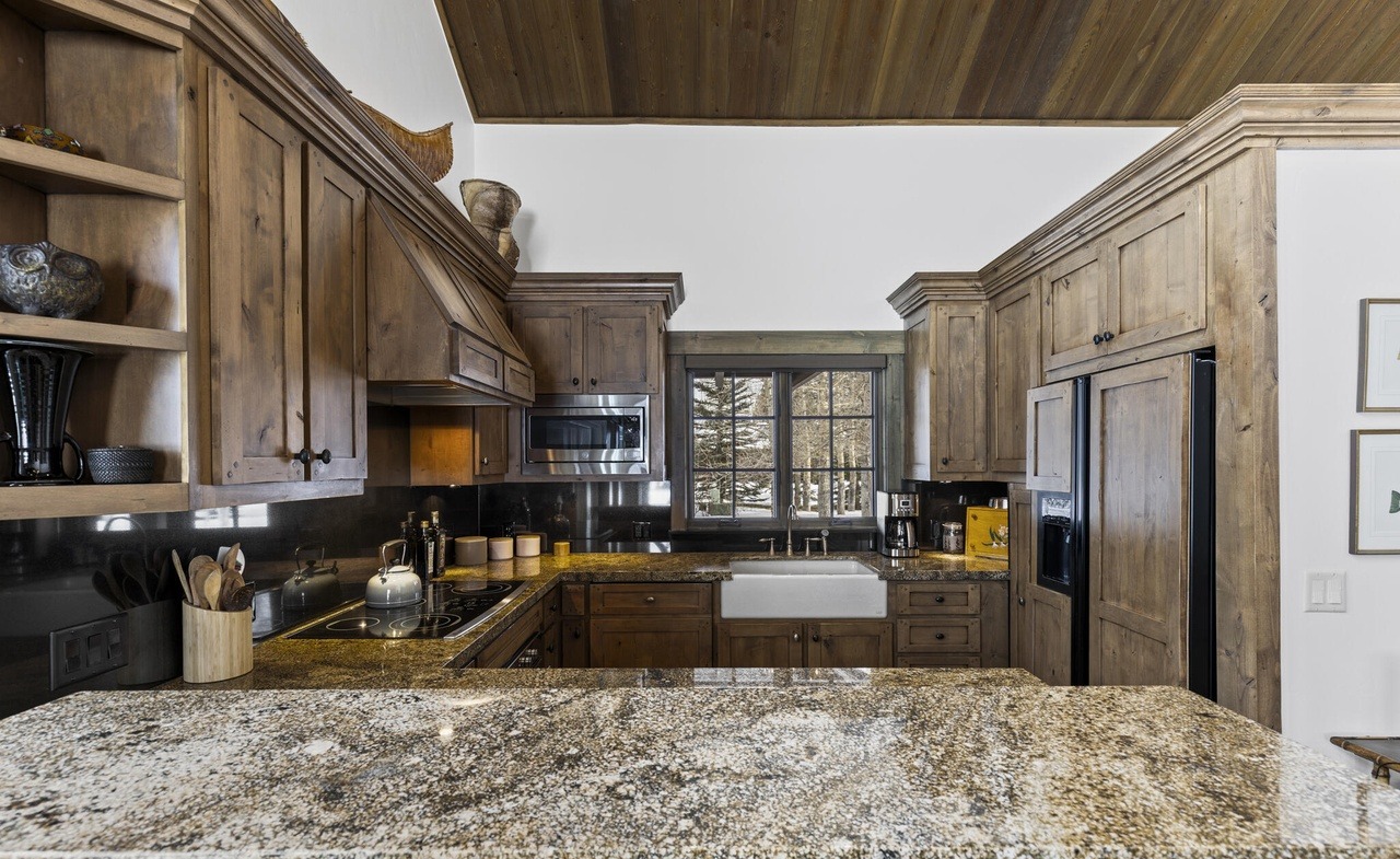 Countertop: GraniteCabinets: Natural WoodCabinet Color: Warm WoodFlooring: HardwoodBacksplash: Stone SlabCeiling: Wood Plank