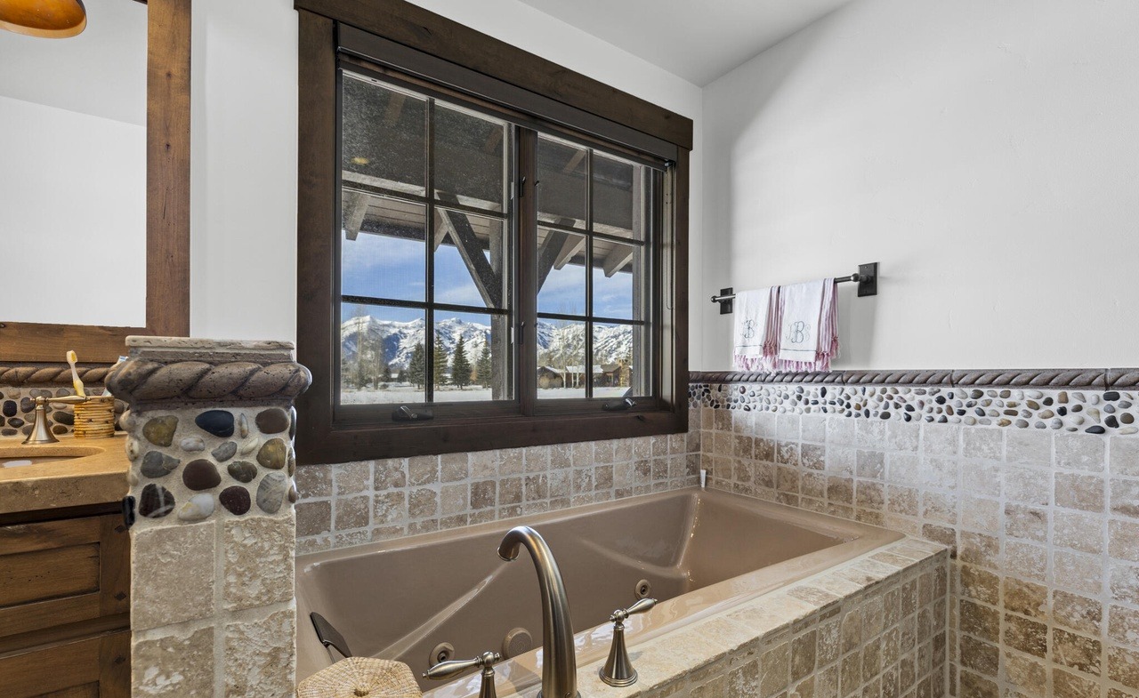 A stunning mountain-modern primary bathroom featuring a luxurious soaking tub positioned to showcase dramatic snow-capped mountain views through floor-to-ceiling windows. The space combines warm travertine tile, river rock accents, and bronze fixtures with clean architectural lines and natural wood beams, creating a serene spa-like retreat that seamlessly blends indoor comfort with the alpine landscape.