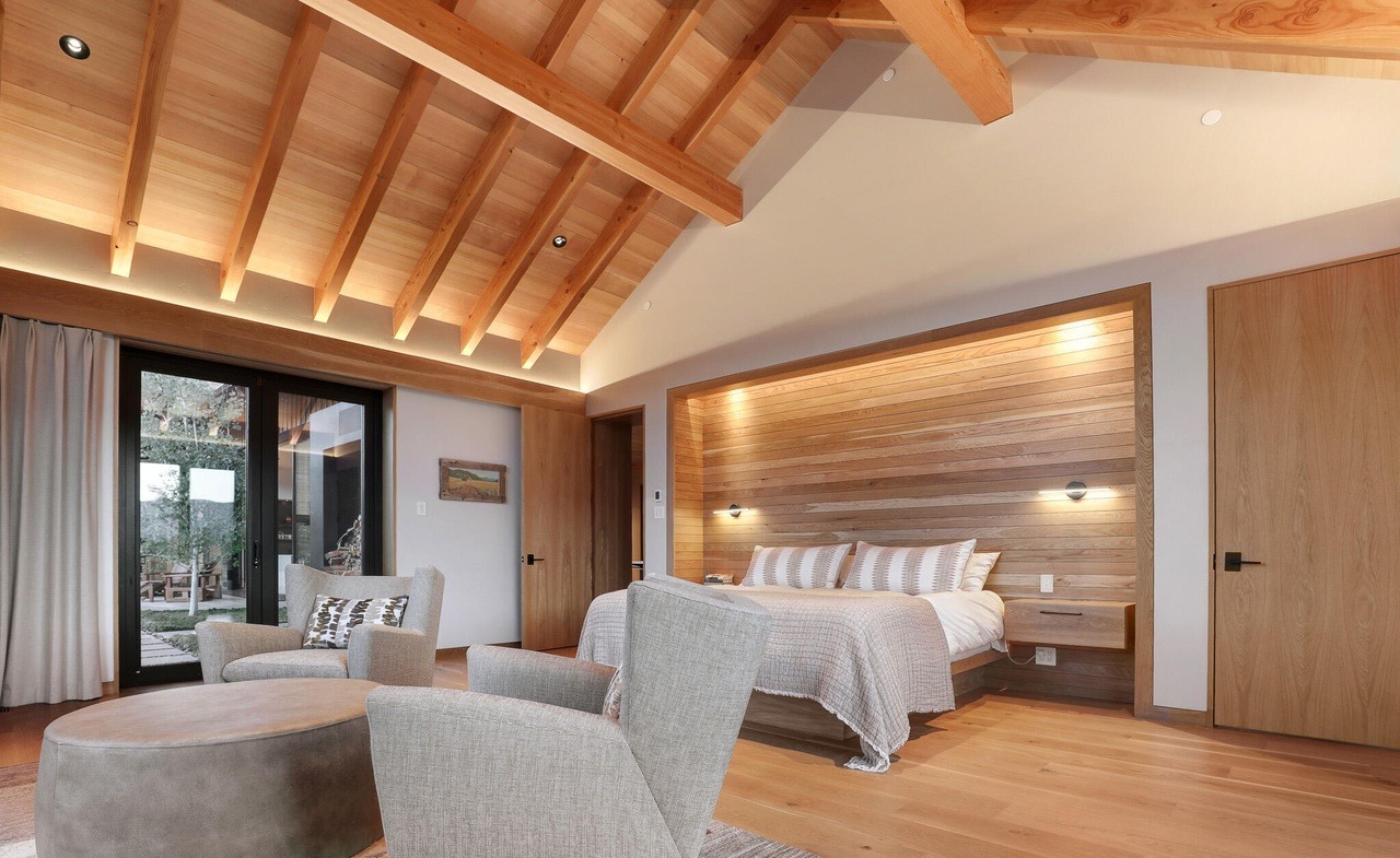 A stunning primary bedroom suite featuring soaring vaulted ceilings with warm wood beam details and integrated ambient lighting, paired with a dramatic horizontal wood-slat accent wall behind the bed. The space seamlessly blends organic materials and modern furnishings through warm hardwood flooring, soft linen seating, and floor-to-ceiling glass doors opening to a serene outdoor landscape, creating an elevated sanctuary that balances luxury comfort with understated elegance.