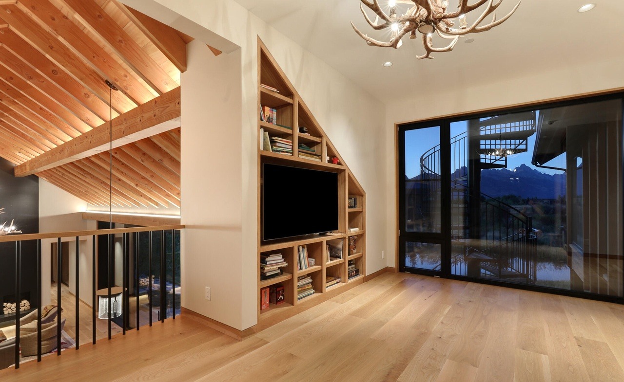 A sophisticated mountain-modern great room featuring dramatic vaulted ceilings with warm exposed timber beams, extensive custom natural wood built-in shelving, and expansive floor-to-ceiling windows framing mountain views. The space masterfully combines organic materials with clean contemporary lines, creating an airy yet warmly luxurious retreat with abundant natural light and refined mountain aesthetic.