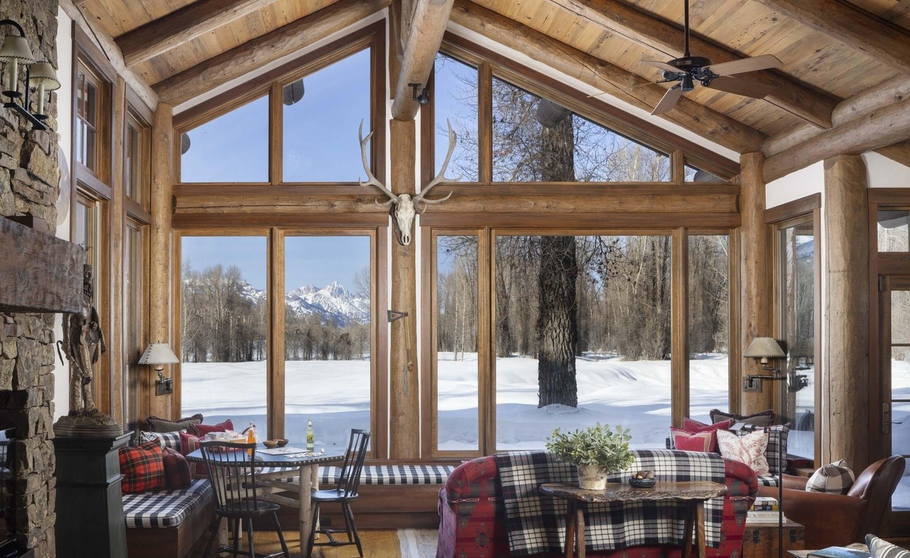 A breathtaking mountain lodge great room with soaring log-beam ceilings, expansive floor-to-ceiling windows framing snow-covered landscape and snow-capped peaks, and a stunning stacked-stone fireplace accent wall. The space elegantly combines rustic lodge aesthetics with refined furnishings in red plaid and neutral textiles, creating a sophisticated yet warm mountain retreat with abundant natural light and commanding views.