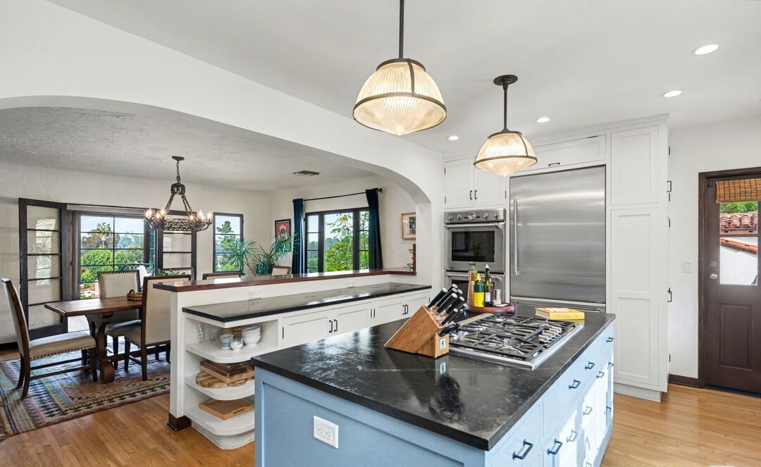 A sophisticated transitional kitchen featuring a light-filled open-concept layout with a distinctive two-tone design: white perimeter cabinetry paired with a soft blue-gray island featuring a dramatic slate waterfall countertop. The space showcases premium finishes including black hardware, professional gas cooktop, stainless steel appliances, abundant natural light from floor-to-ceiling windows with teal-frame detailing, and sculptural pendant lighting that anchors the composition.
