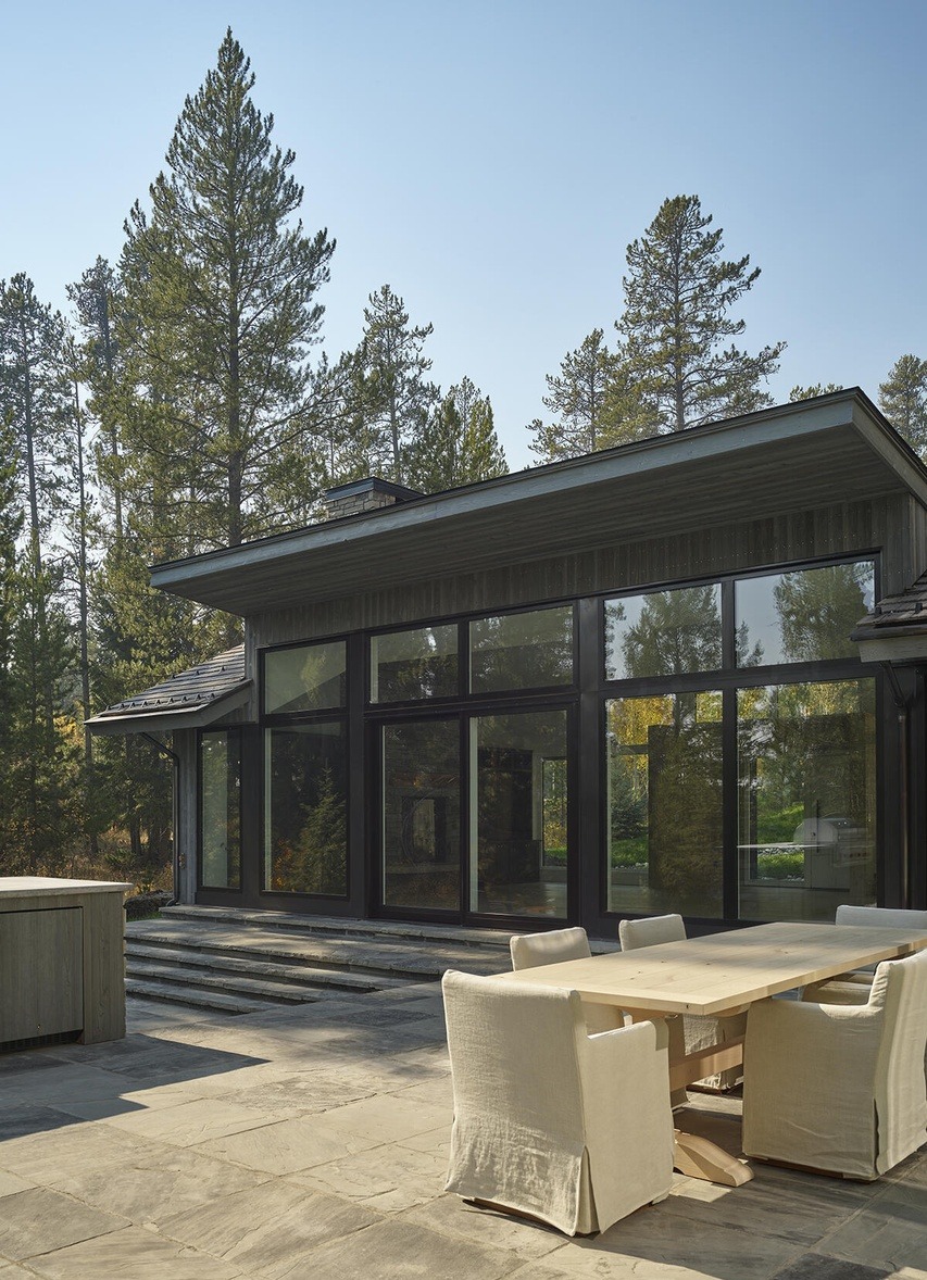 A sophisticated mountain-modern patio featuring expansive black-framed glass walls overlooking towering pine trees, creating seamless indoor-outdoor living. Clean-lined furnishings in neutral tones and natural stone flooring establish a serene, minimalist aesthetic with abundant natural light and refined luxury.