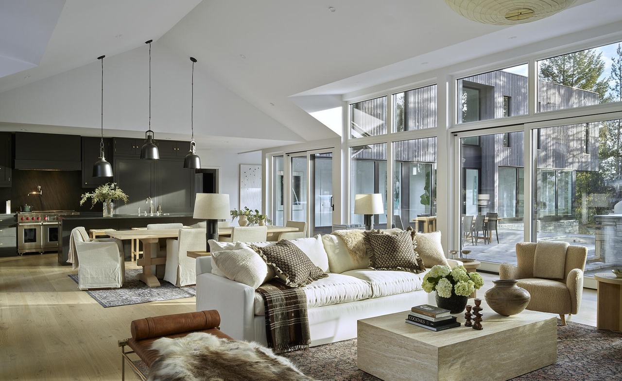 A sophisticated open-concept living space seamlessly blending contemporary comfort with transitional elegance, featuring abundant natural light from floor-to-ceiling windows, a coffered ceiling with pendant lighting, and a carefully curated palette of whites, creams, and warm wood tones accented by dark cabinetry and bronze hardware. The layered design combines modern furniture silhouettes with traditional architectural details and high-quality textiles, creating a serene yet luxurious atmosphere ideal for both entertaining and everyday living.