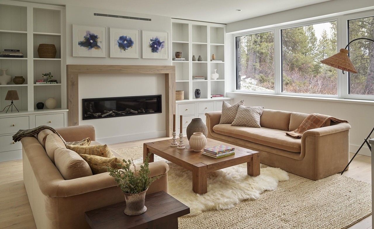 A serene and sophisticated living room featuring warm neutral tones, custom white built-in cabinetry, and cream leather seating arranged around a linear fireplace. Floor-to-ceiling windows flood the space with natural light, while curated blue abstract artwork and organic materials create a calming, modern aesthetic grounded in natural elegance.