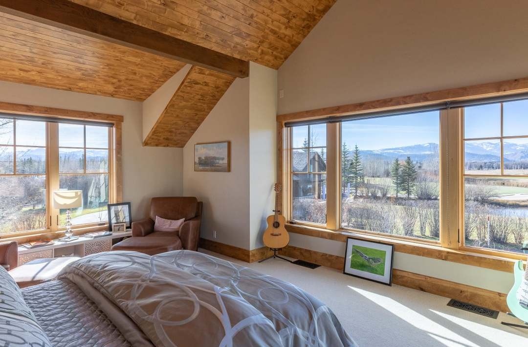A stunning mountain_modern primary bedroom featuring soaring timber beam ceilings, expansive floor-to-ceiling windows framing pristine mountain and meadow views, and warm cream-toned walls that create a serene, sophisticated retreat. The space masterfully combines organic natural materials with contemporary openness, offering abundant natural light and a luxurious sense of connection to the surrounding landscape.