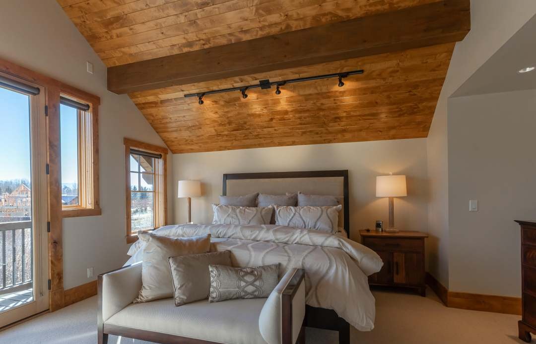 A stunning mountain-view primary bedroom featuring dramatic exposed timber beams and vaulted ceilings that frame floor-to-ceiling windows flooding the space with natural light. The warm neutral palette, quality furnishings, and architectural sophistication create an exceptionally serene and luxurious retreat.