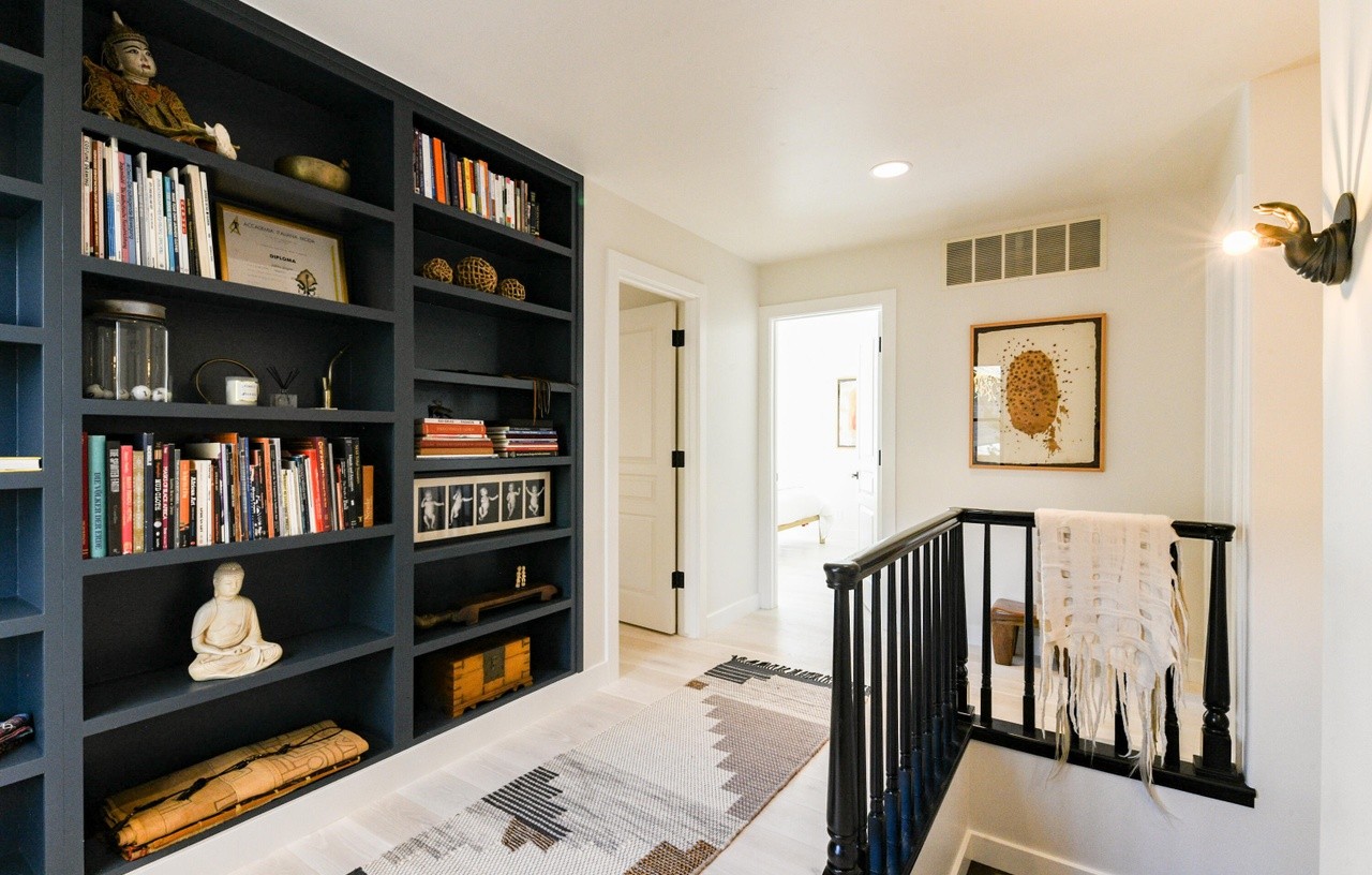 An elegantly appointed hallway featuring floor-to-ceiling navy built-in shelving styled with curated books, decorative objects, and art, anchored by a polished black staircase with turned balusters. The space balances classic architectural details like crown molding with contemporary design through its refined color palette and carefully composed modern artwork, creating a sophisticated transitional aesthetic.