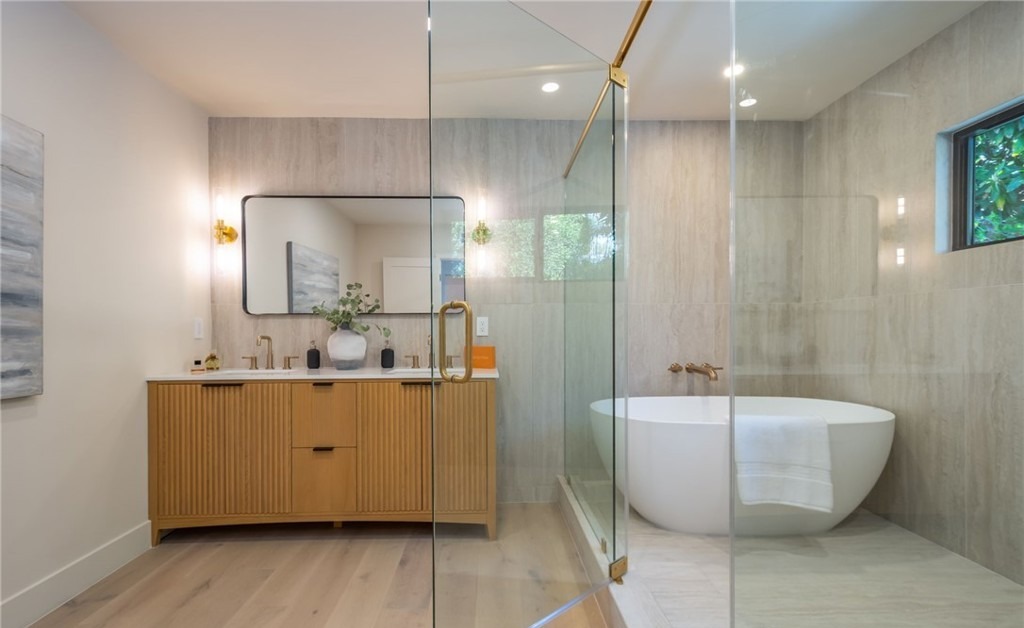 Freestanding TubWalk In ShowerFrameless Glass EnclosureFloating VanityStatement LightingDouble Sconce LightingSkylightVessel SinkCustom Millwork
