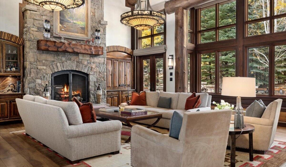 A grand mountain lodge-inspired living room featuring a striking stone fireplace with an arched opening, massive exposed timber beams, and soaring ceilings with elegant brass disc chandeliers. The sophisticated transitional design seamlessly blends rustic architectural elements with contemporary furnishings in warm neutrals, while expansive multi-pane windows flood the space with natural light and forest views, creating an inviting yet opulent retreat.