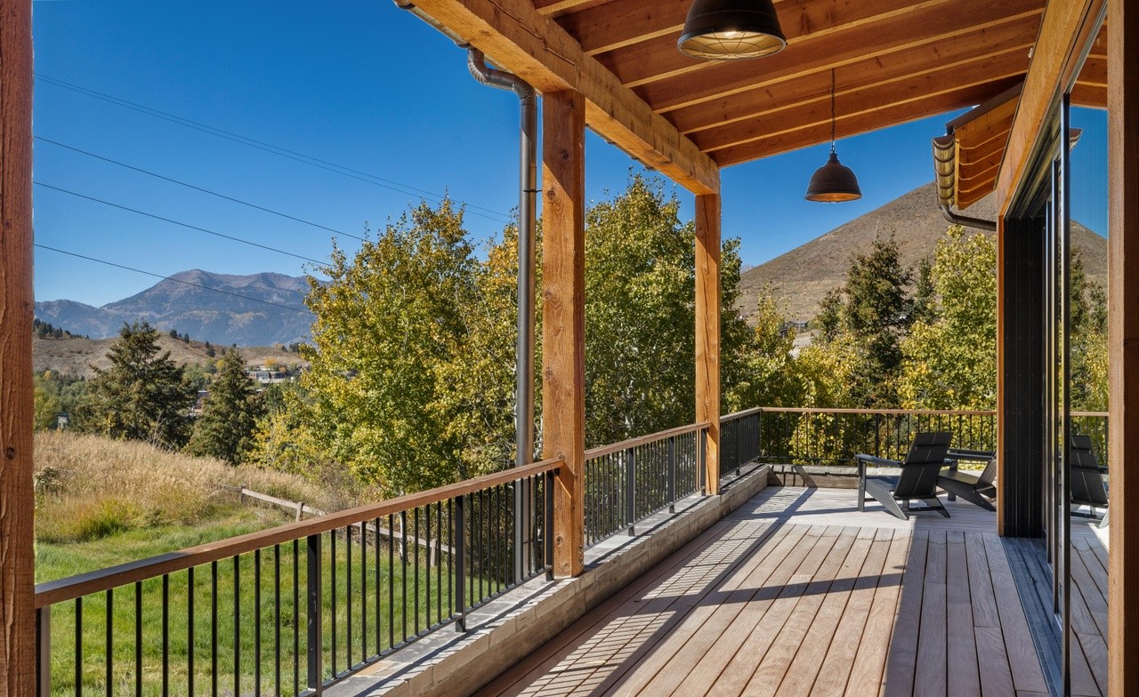 A sophisticated mountain-modern covered patio featuring exposed timber beams and a composite deck overlooking dramatic alpine landscape, anchored by contemporary black metal railings and sculptural pendant lighting. The design seamlessly merges indoor comfort with outdoor vistas through large glass doors and thoughtful architectural detailing.