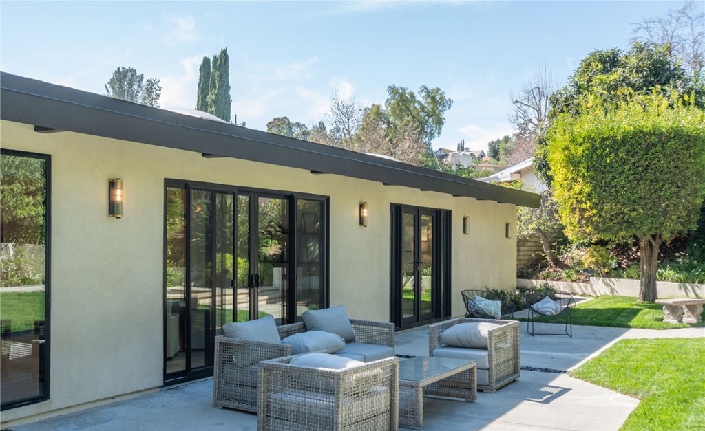 A sophisticated modern patio seamlessly integrating indoor and outdoor living with clean architectural lines, warm cream stucco walls, polished concrete flooring, and curated woven outdoor furnishings with soft blue cushions. The space exemplifies contemporary desert modernism with abundant natural light, abundant greenery integration, and minimalist design restraint.