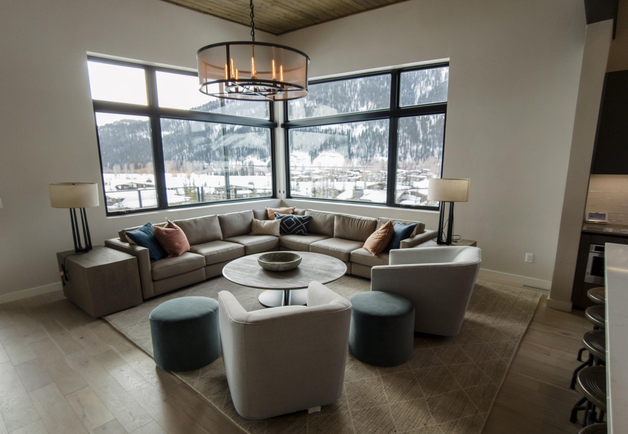 A sophisticated mountain-view living room featuring warm organic materials paired with clean modern furnishings, anchored by expansive floor-to-ceiling windows framing stunning alpine vistas. The curved sectional and contemporary lighting fixtures create an inviting yet refined gathering space with excellent natural light and thoughtful material composition.